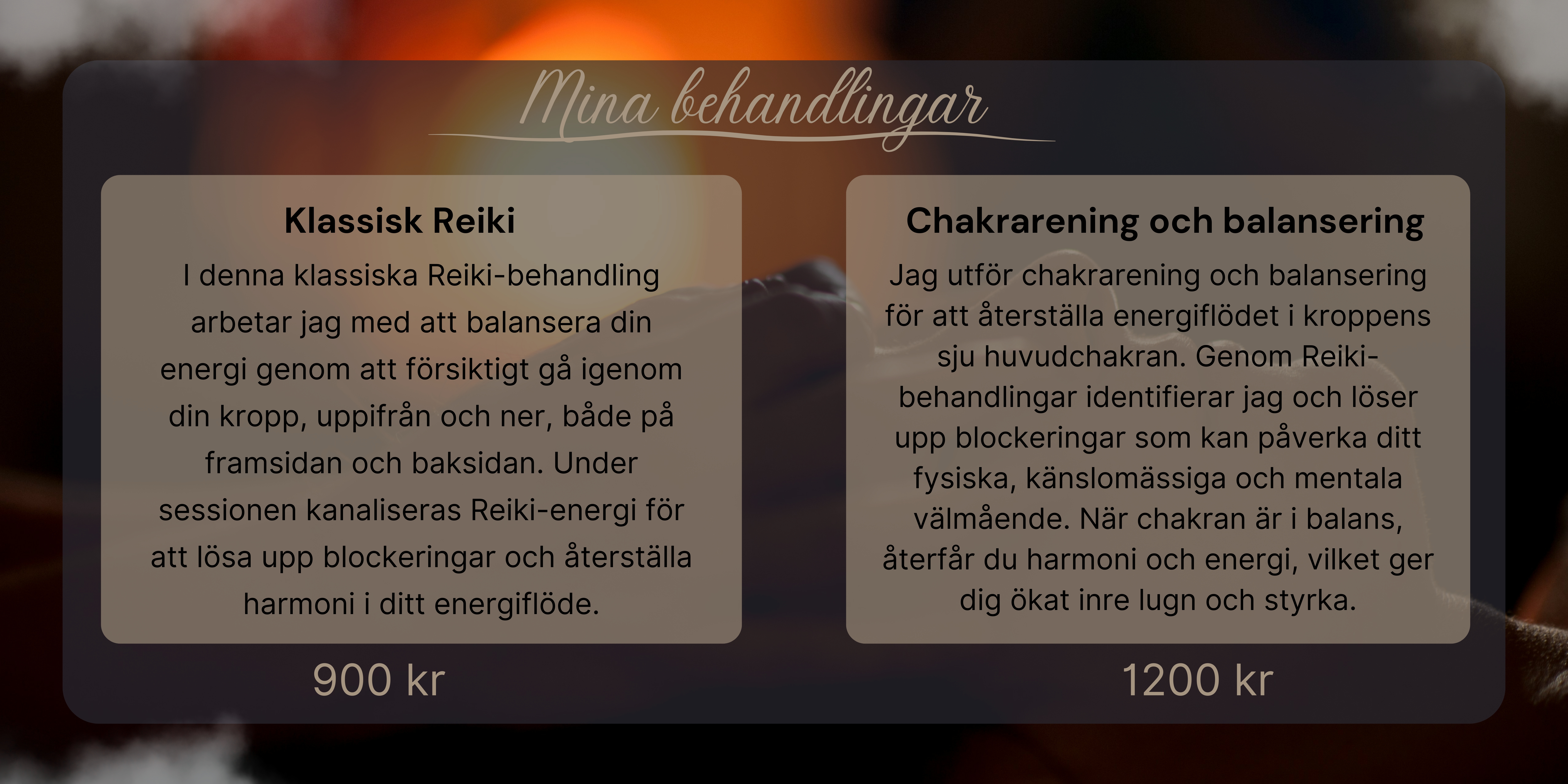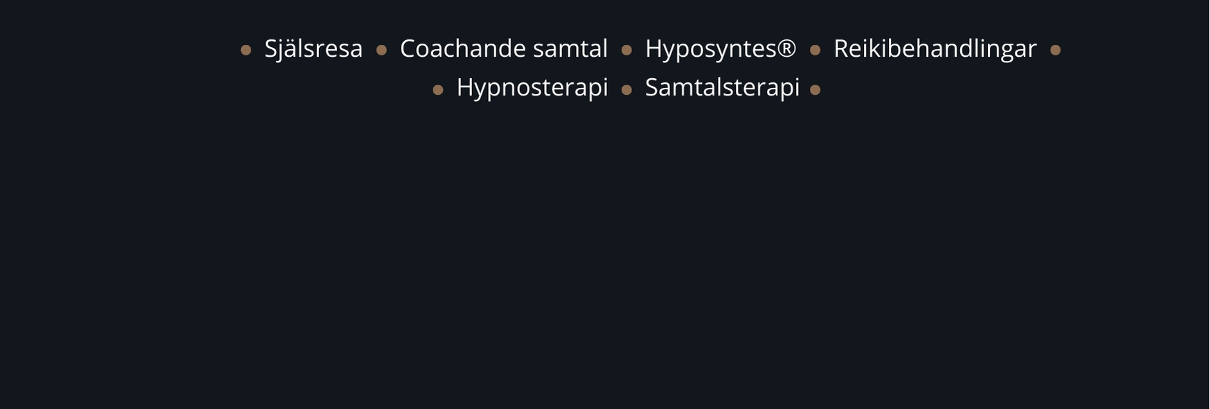 Jag har tagit till mig de behandlingsmetoder som känns rätt för mig, de som talar till den jag är och som jag vet verkligen hjälper mig att hjälpa dig. I min verktygslåda finns bland annat Hyposyntesterapi®, Hypnosterapi, Reiki (Usui Shiki Ryoho), Coachande samtal och Chamansk healing. Jag använder också meditationer och ceremonier för att ge balans och ett större inre lugn.